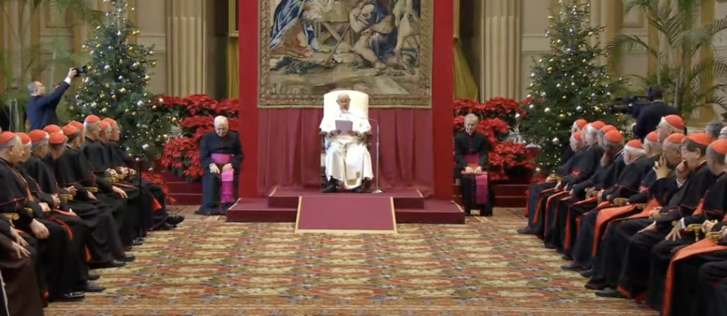 El Misterio de la Navidad mueve nuestros corazones al asombro —palabra clave— de un anuncio inesperado: Dios viene, Dios está aquí, en medio de nosotros, y su luz ha irrumpido para siempre en las tinieblas del mundo. Necesitamos escuchar y recibir siempre este anuncio, especialmente en un tiempo todavía marcado tristemente por la violencia de la guerra, los riesgos tremendos a los que estamos expuestos debido al cambio climático, la pobreza, el sufrimiento, el hambre —¡hay hambre en el mundo!— y otras heridas que habitan nuestra historia. Es reconfortante descubrir que incluso en estos “lugares” de dolor, como en todos los espacios de nuestra frágil humanidad, Dios se hace presente en esta cuna, en este pesebre, que hoy eligió para nacer y llevar el amor del Padre a todos; y se hace presente según el estilo que le es propio, con cercanía, compasión y ternura.